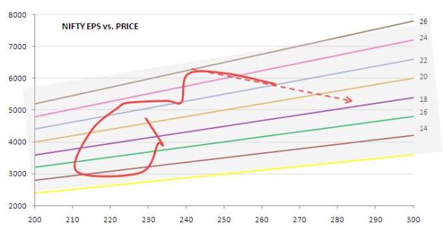 Played around some more with the market data. The chart below plots the locus of the NIFTY (solid, curvy red line) across the various EPS’ that it has had on the first day of each quarter since 1Apr2008 superimposed between a band of P/Es ranging from 12 to 26. The NIFTY has flirted with both these P/E envelopes at least once since 1Apr2008. Cycloidal? We are around 260 now. If it is cycloidal then it must droop. Which means the markets must fall. Am I crazy or are the markets crazier? 🙂