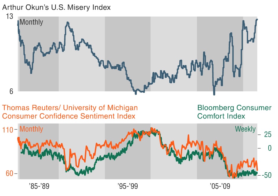 The Misery Index was conceived by Arthur Okun, an economist at Yale University and the Brookings Institution who served as an adviser to Presidents John F. Kennedy and Lyndon Johnson. Currently, it stands at 12.8, the highest in 28 years. The chart below (idea for post borrowed from Financial Armageddon) depicts the relationship between consumer confidence indices & the Misery Index.
