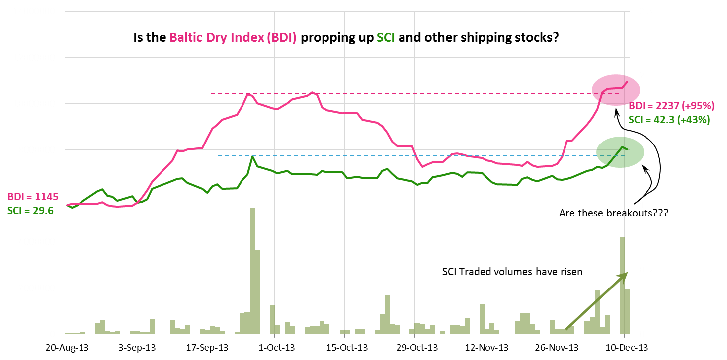 This has been a pretty good trade and I guess it’s time to unwind now. I am never good with breakouts and get extremely edgy at the top – it runs counter to how many momentum people think and act but I think I suffer from vertigo. This is lucky cause I had no clue what the Shipping Corporation of India (SCI) has been doing or is about to do. I later on realized that they are in the doldrums and are getting rid of their “Black Pearl” and their attempts to raise prices are getting whooped by competition. No wind in their sails, so to speak. The pearl bit is not off the mark given that SCI is in danger of losing its “Navaratna” status – whatever it means. I am no Jack Sparrow. I entered when I happened to see the Baltic Dry Index (BDI) spike up at end Sep. I had no clue about the differences between spot contracts and forward contracts rates and the billing mix for SCI. All that wisdom comes in hindsight!! In this case it has been pure luck. 🙂
