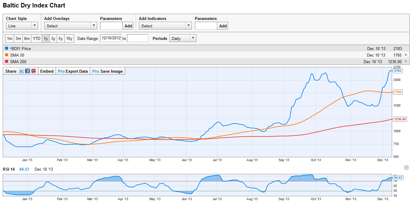 The BDI technical chart (via ycharts.com) looks overbought to me. I may be wrong and I guess breakouts are all about RSI remaining in elevated levels, but when you get some gains on pure luck and nothing else, I don’t believe in “letting the profits run”. 😉