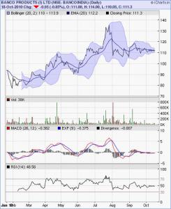 3. Banco Products: What I am really doing is flipping coins between Balmer Lawrie and Banco Products. This one is a Gujarat based company which has been around for 50 years but appears to be selling cheaply as well. It has made auto-equipment all these years and is now getting into cement business as well. Duh. It supplies it’s gaskets and radiators to companies like Tata Motors, TVS Suzuki, M&M, Maruti Udyog etc. It’s operating margins (@ 26%) are highest amongst peer group companies like Bosch, Bharat Seats and UCAL fuel systems. With an expectation of a FY’11 EPS of 12, the CMP gets discounted 9.25 times – that’s not bad. This really has been a turnaround story over the past couple of years with the share price jumping up from the 20s to the current 110 levels. Given the market cap of INR 800 crores (= USD 178 million) over an expected sales of INR 550 – 575 crores for FY’11, the stock still looks a tad cheap. Recently they acquired a company in Europe and are setting up a cement plant in Tanzania. Seems like these guys are confident of what they are doing. On the charts, I see a Bollinger Squeeze which to me means that it can shoot up or down from here. But the RSI and MACD are not there yet for me. I am biased towards Banco, so I think I’ll throw in some coins tomorrow. Let’s see.