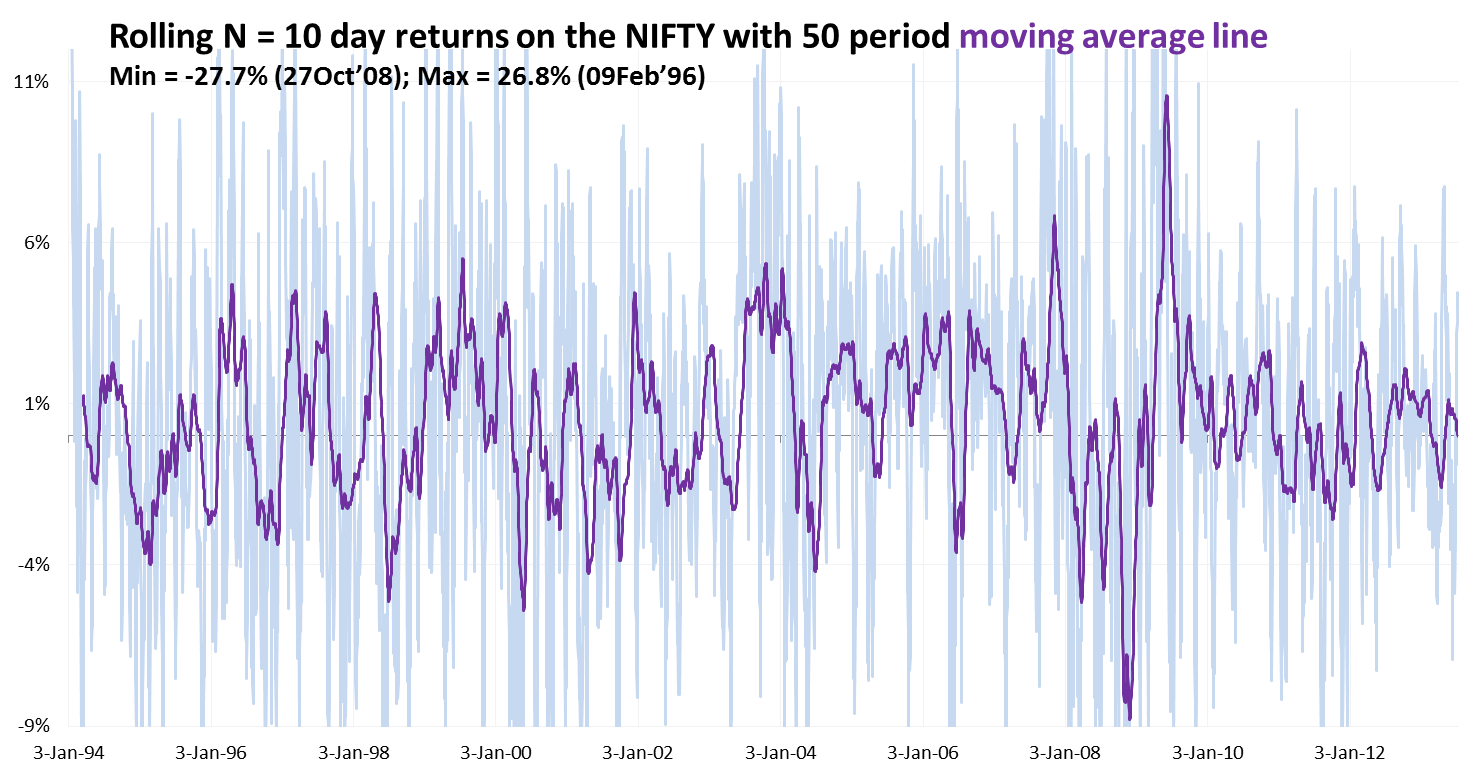 VIX as a trading indicator: Since the VIX is a measure of dispersion and has a reversal to the mean property, all the standard technical indicators like RSI, Bollinger Bands etc can be used as identifiers for trade entry points. Since we do not have derivatives on the VIX in India yet, these technicals can give entry points into the underlying (i.e. NIFTY) by inverting the logic (buy for VIX would be a sell for NIFTY) due to the high -ive correlation between NIFTY and VIX. There have been studies which point out that the 2 period RSI on the VIX gives a very good trading signal. If the RSI (2) of the VIX >90, then buy the underlying and if RSI (2) < 30, then sell the underlying. Underlying = NIFTY in our case. I do not have any ready charting software at hand, so I will have to painstakingly generate the RSI values in a spreadsheet if I have to test and see how this really could have played out on historical data. Maybe fodder for a future post…